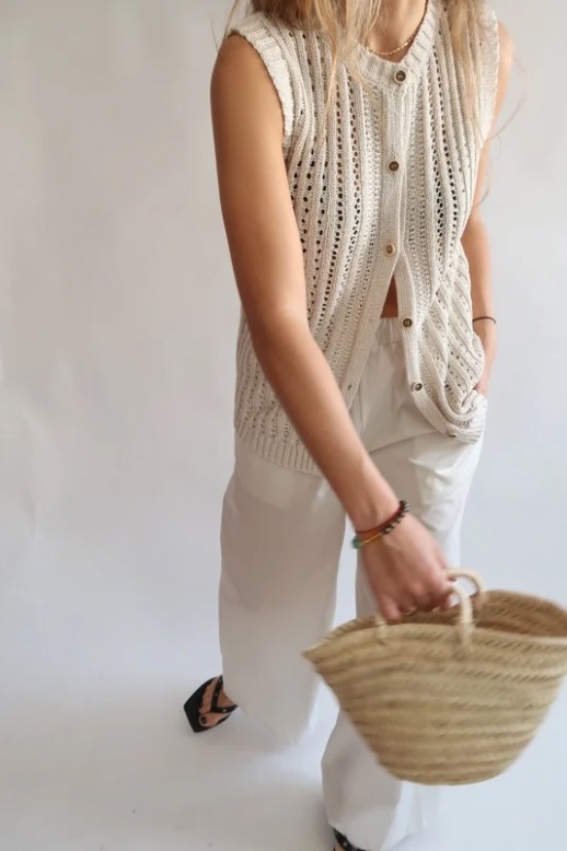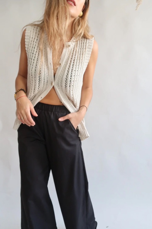 Descubre cómo crear looks únicos con prendas atemporales. Nuestro Chaleco de punto queda ideal con el Palazzo Tecnológico negro y para rematar el look, la prenda estrella de la temporada: Los espartos artesanales. En este caso lo combinamos con los de leopardo de serraje y piel. What else?
